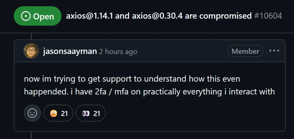 If you performed a build or update between 00:21 and 03:40 UTC on 31 March, your system is likely at risk. Check your lockfiles for Axios versions 1.14.1 or 0.30.4 and the plain-crypto-js package.