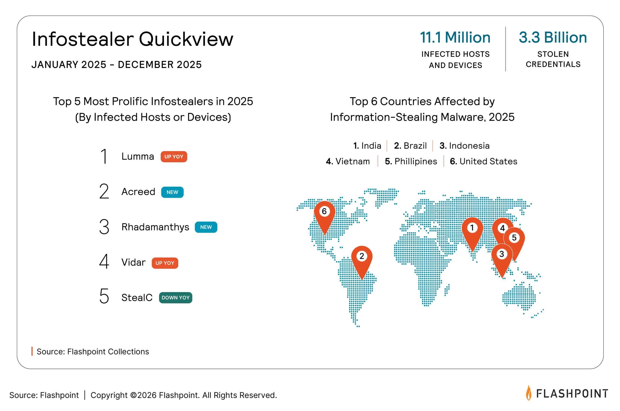 Flashpoint observed over 11.1 million machines infected with infostealers in 2025, fueling a massive inventory of 3.3 billion stolen credentials and cloud tokens. The fundamental mechanics of cybercrime have shifted from breaking in to logging in, as attackers leverage stolen session cookies to behave like legitimate users.