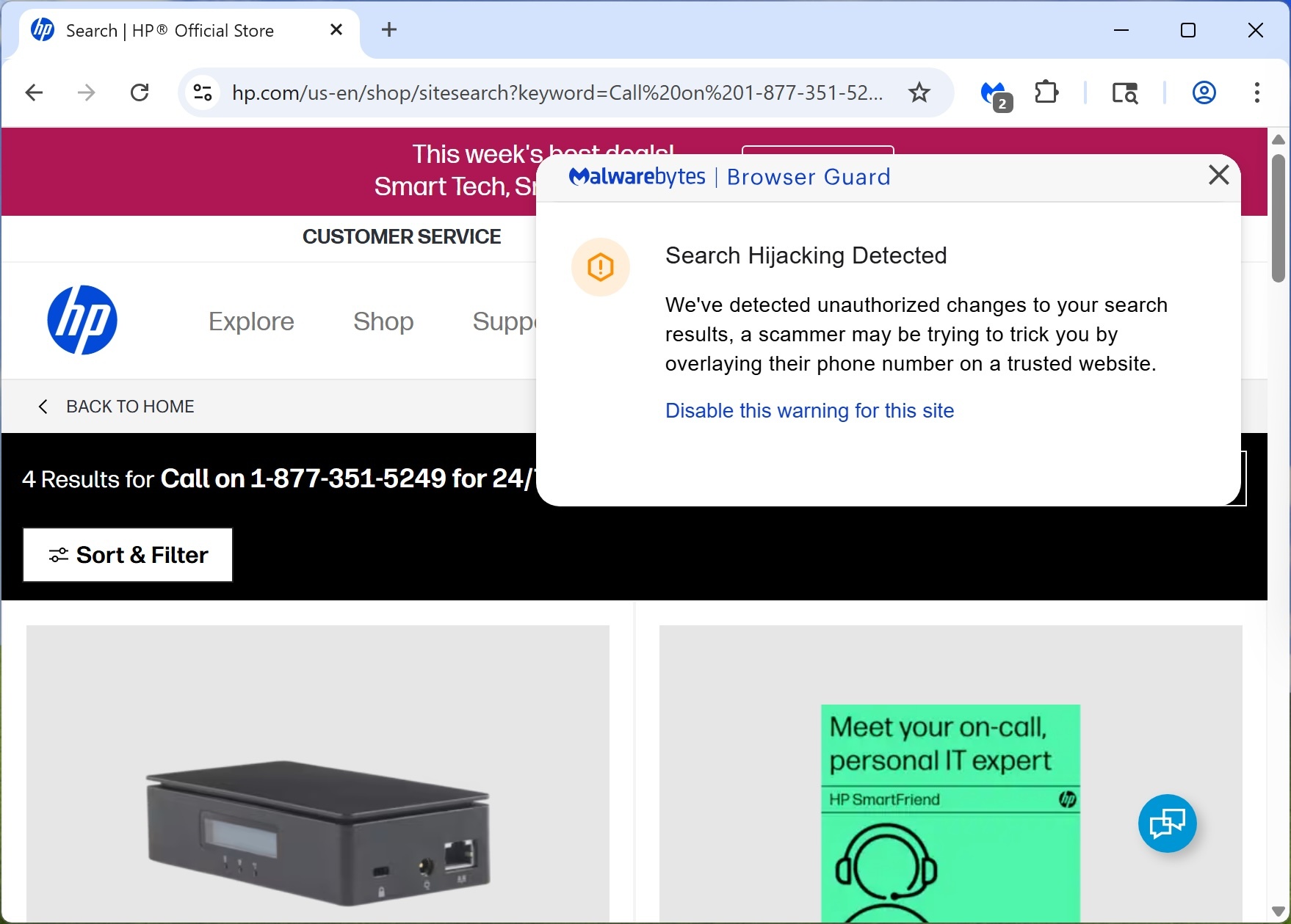 Fortunately, Malwarebytes Browser Guard caught this and shows a warning about “Search Hijacking Detected,” and explains that unauthorized changes were made to search results with an overlaid phone number.
