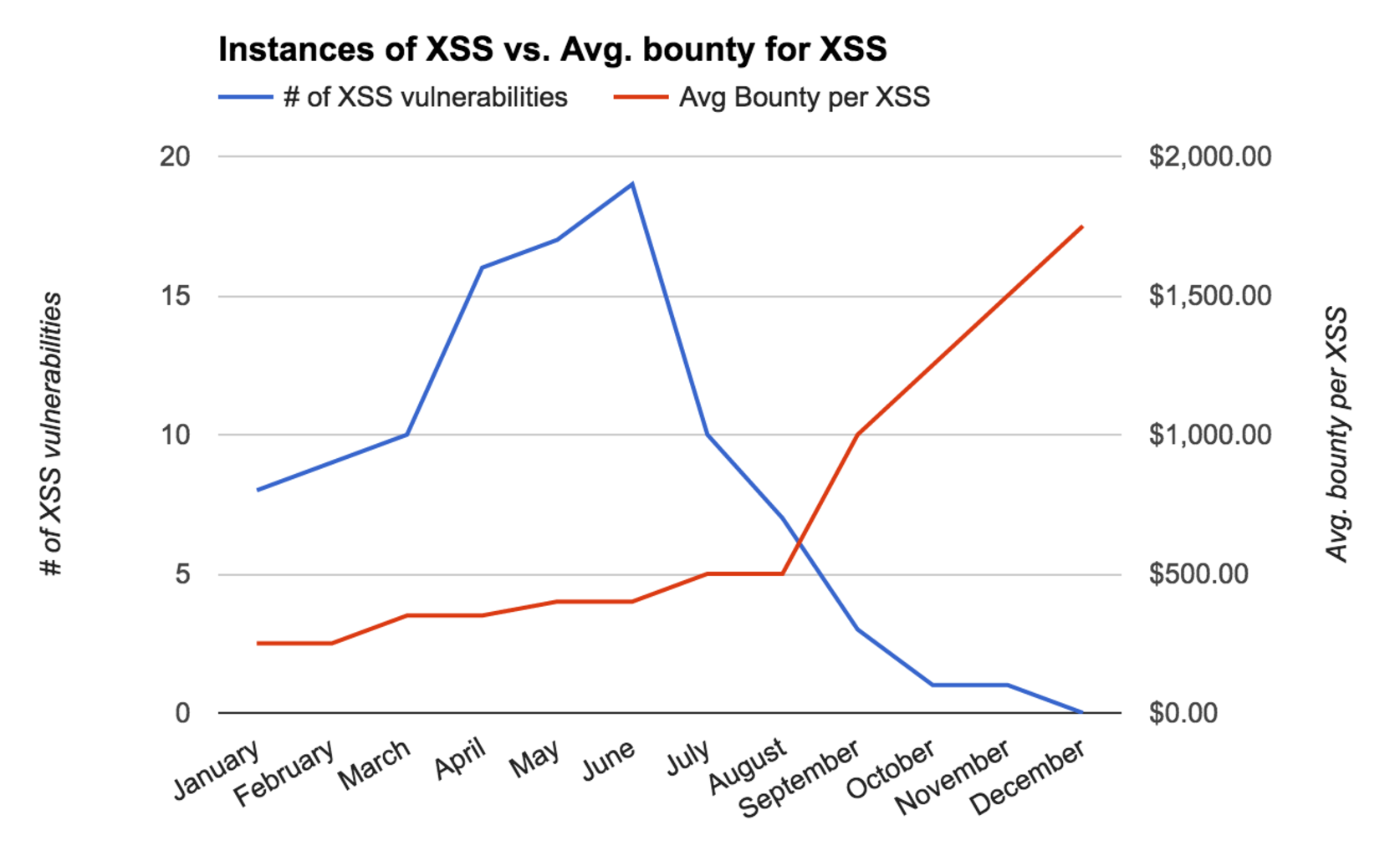 In the chart below, it can help inform how effective your measures to fight against XSS are. Probably very effective, seeing that XSS is tapering off fast after July, while the average bounty for this type of vulnerability is going up. There’s no better proof that your measures are working than offering top-dollar for a certain class of vulnerability and receiving very little to no incidents of that type.