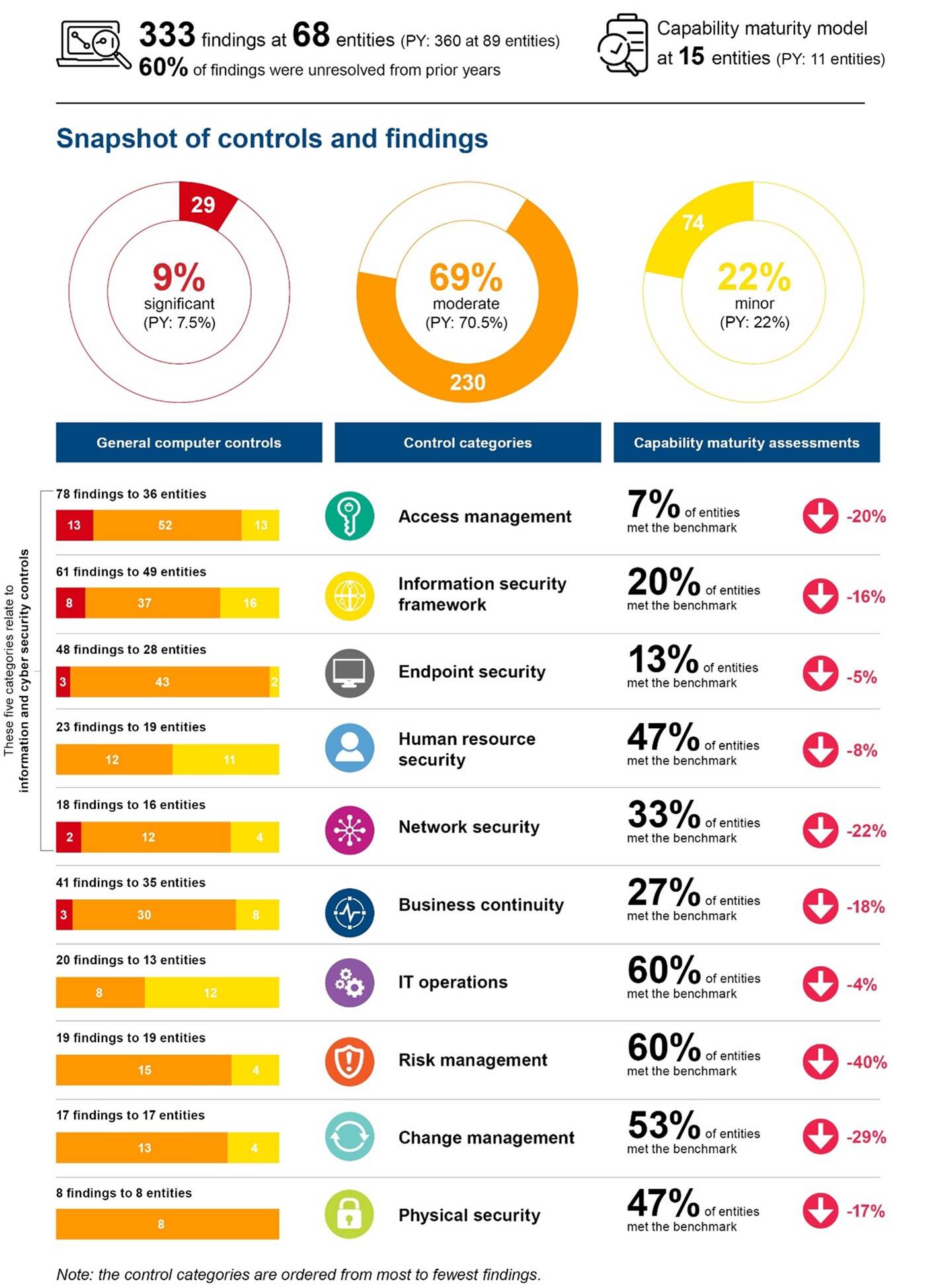 At the 15 selected entities audited, capability maturity assessments showed a decline across all 10 control categories compared to last year.
